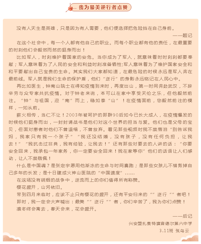“我为最美‘逆行’者点赞”全区中小学生书信作品选登(第七期)